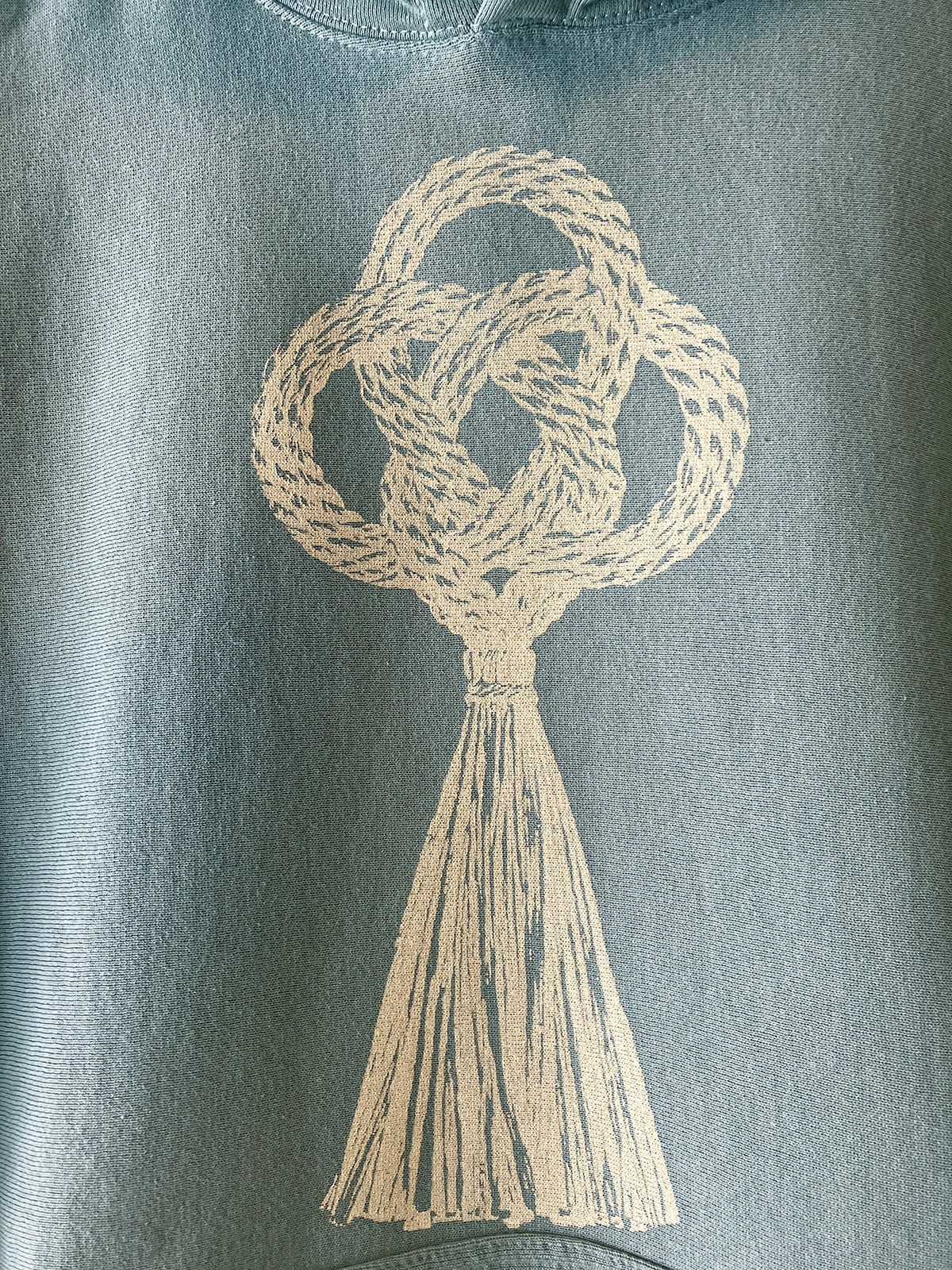 くすんだ微妙なニュアンスカラーのスモーキーグリーンにライトベージュのあわじ結びの真菰精麻飾りの絵をプリントしています。