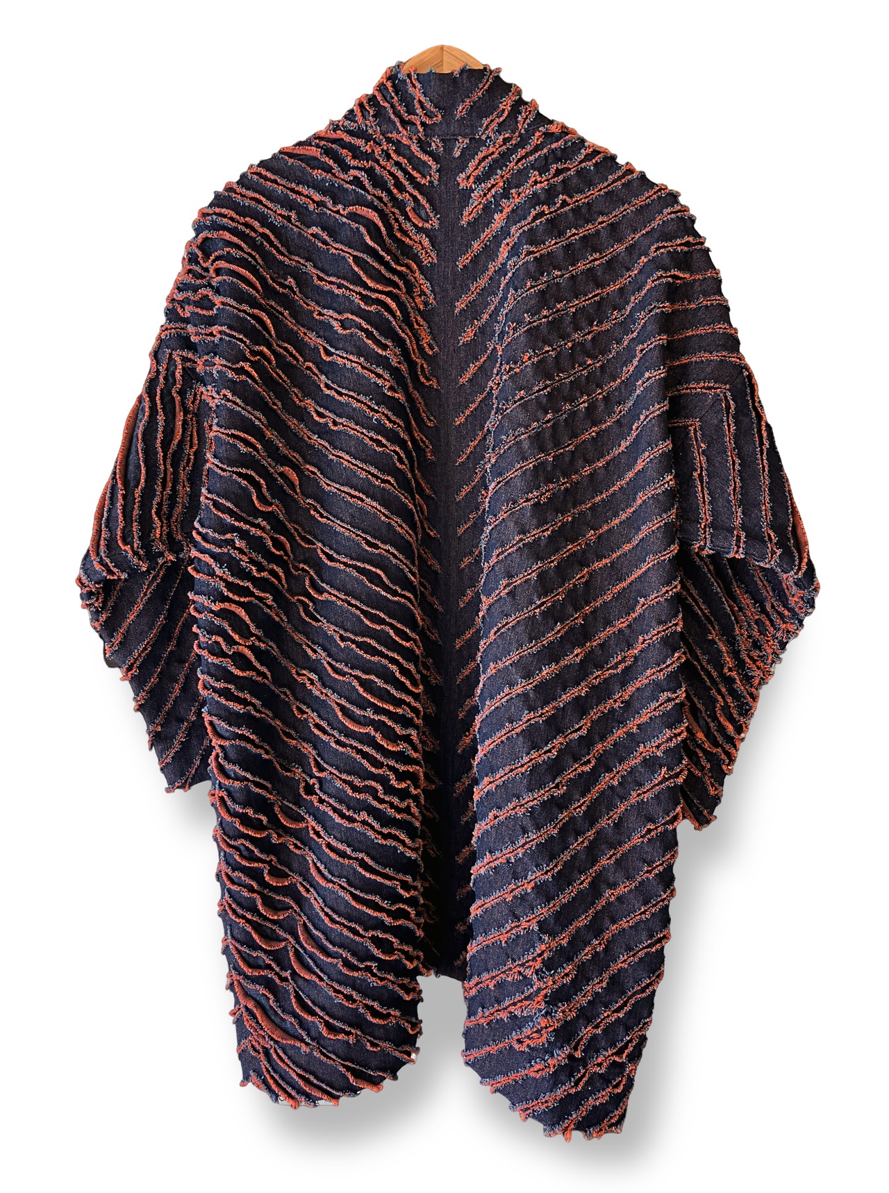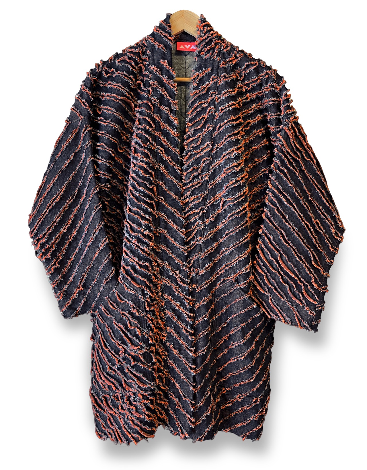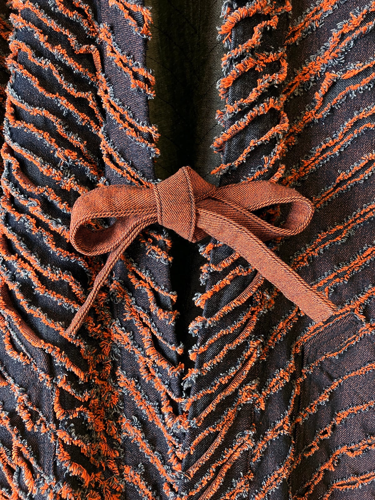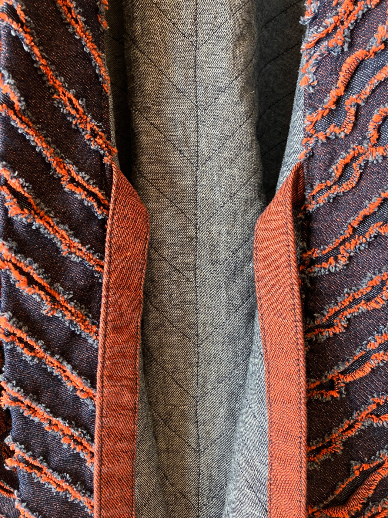 全面的にスラッシュ加工を施したカラーデニムとヘンプデニムを用いた羽織です。