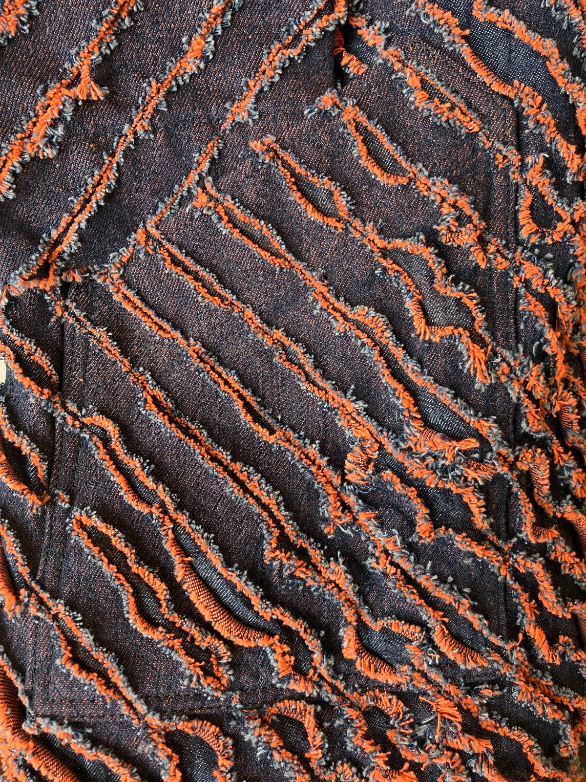 上のデニム生地が切り裂かれ、オレンジとインディゴの糸が露わになっています。